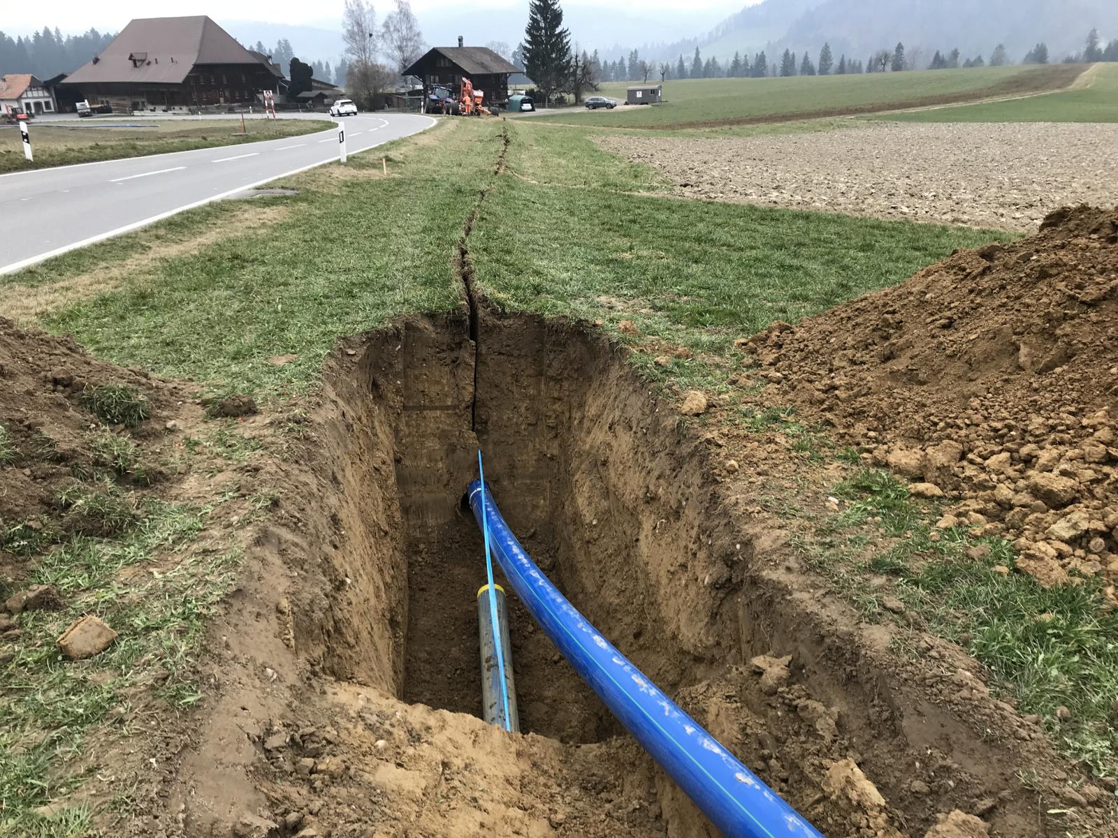 Wir verlegen jährlich 60 – 70km Rohre. Ob Kabelschutzrohre, Wasserleitungen, Kanalisationen, Fernwärmerohre, Pumpenleitungen oder Kanalisationen mit diesem Leitungsbau - Verfahren können Sie effizient und kostengünstig bauen.